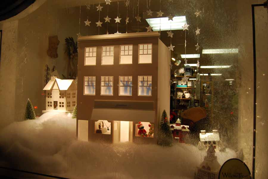 3. Blogger and photographer enthusiast Lew, found this beautiful winter window scene at his local jewelry store. Recreate the same feeling using pre-lit ceramic decorative holiday house and faux snow available at most all large retailers.4. Decorate the window's floor with your store's holiday wrapping paper and use your packaging materials (bows, bags, stickers, and boxes) to decorate a mini Christmas tree with a few open jewelry boxes, featuring your top selling styles and a crumpled up piece of wrapping paper beside each box as if she had just opened it Christmas morning.5. Think outside the box! Blogger, Anne of Ritournelle in her report on Herme's 2010 window diplays showed that anything can be a jewelry display. Yes, even a pine cone can display jewelry! Visit your local craft store for other great display alternatives such as ornaments or silk flowers.