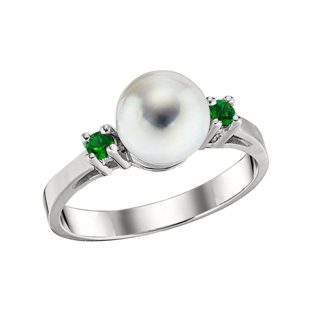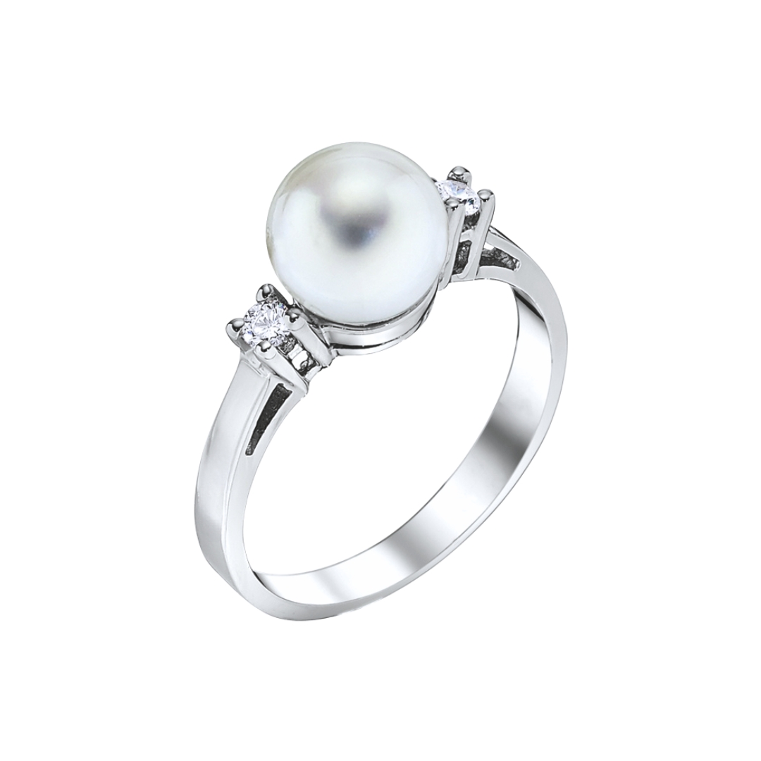 Quintessential jewelry! Our timeless pearl and diamond jewelry suite includes this classic Akoya cultured pearl ring, featuring two round brilliant diamond side stones atop a classic gold band. The ring is crafted in 14KT yellow, white, and rose gold and can be customized to accommodate emeralds, rubies, or sapphires in place of the diamond side stones.