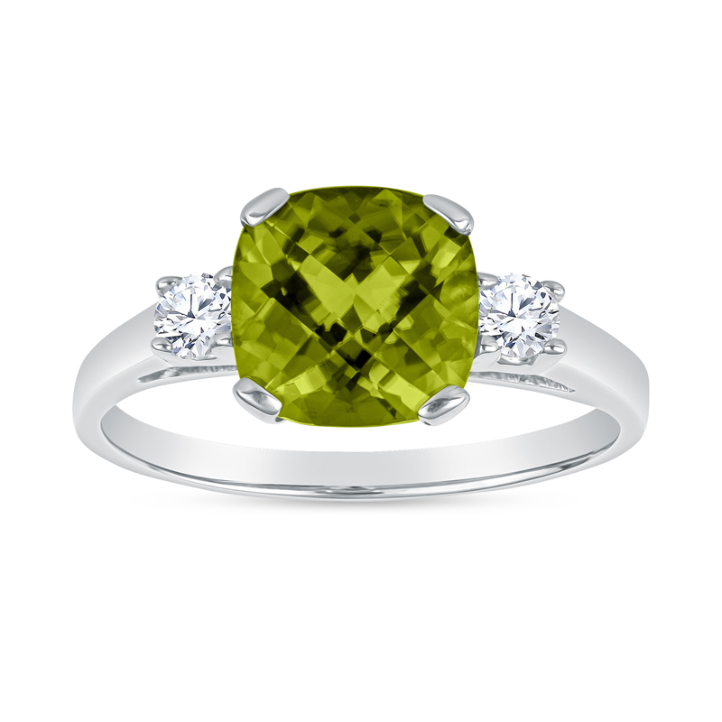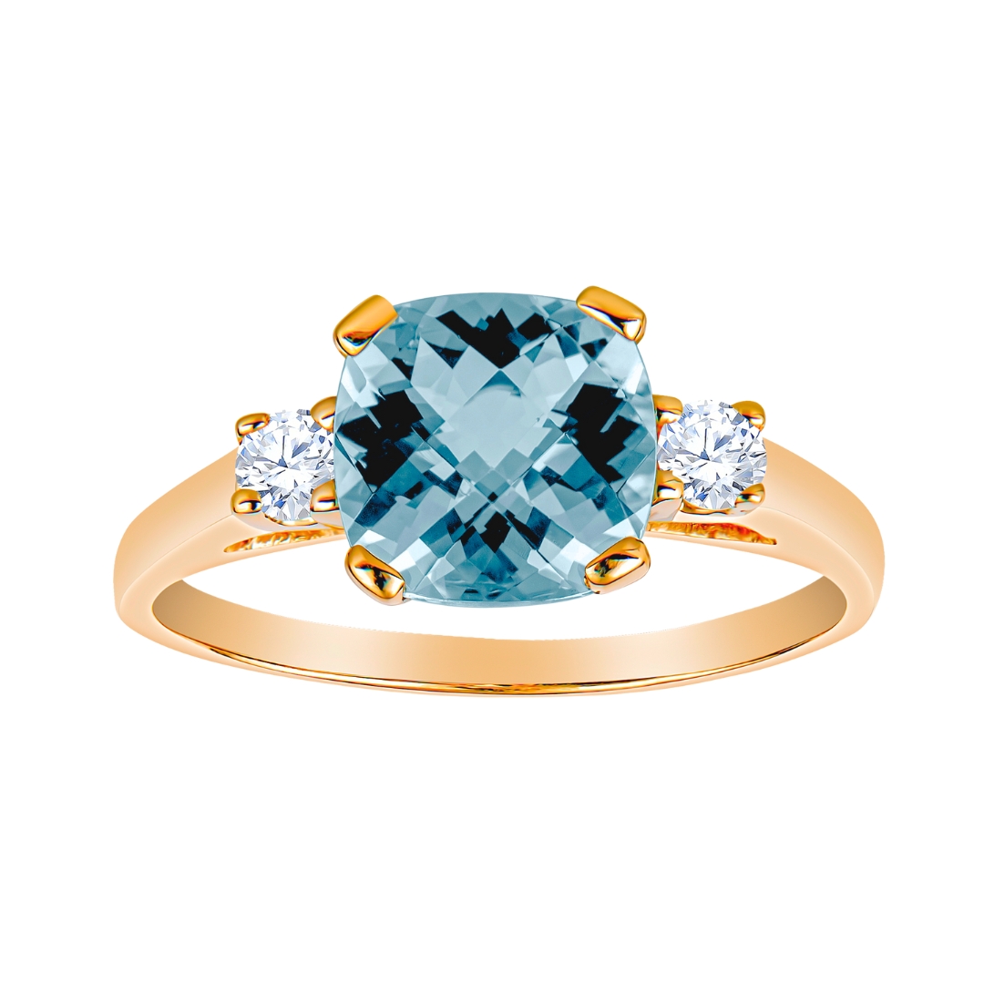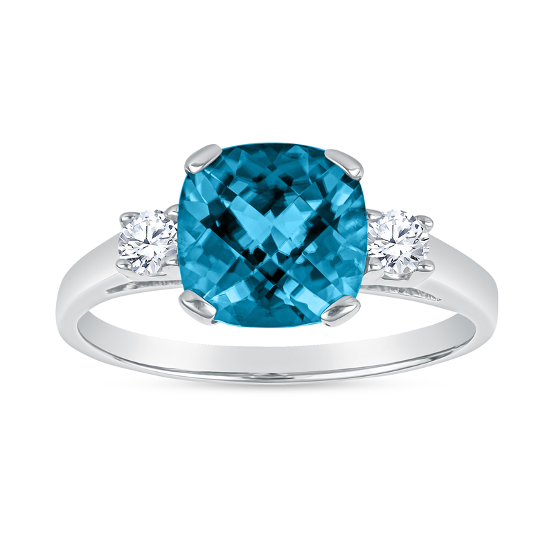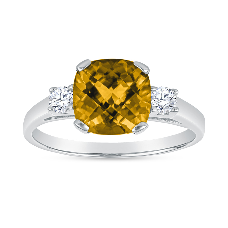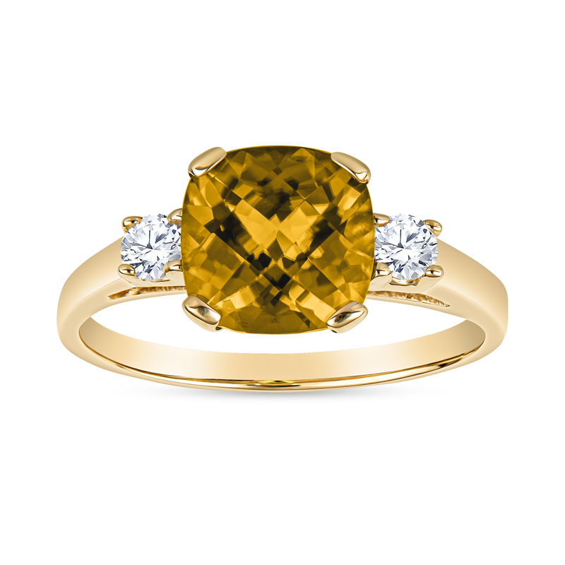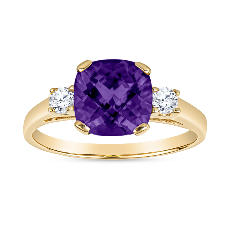 Classic, balanced, and elegant; this semi-precious gemstone ring features either a cushion cut amethyst, aquamarine, blue topaz, blue zircon, citrine, garnet, rhodolite garnet, or peridot a top a classic tapered gold band. The band is cast in 14KT yellow or white gold and set in a 4 prong setting for an 8MM center stone, flanked on the shoulders by 2 X .10CT round, brilliant, ideal cut, fine make diamonds; made in USA.