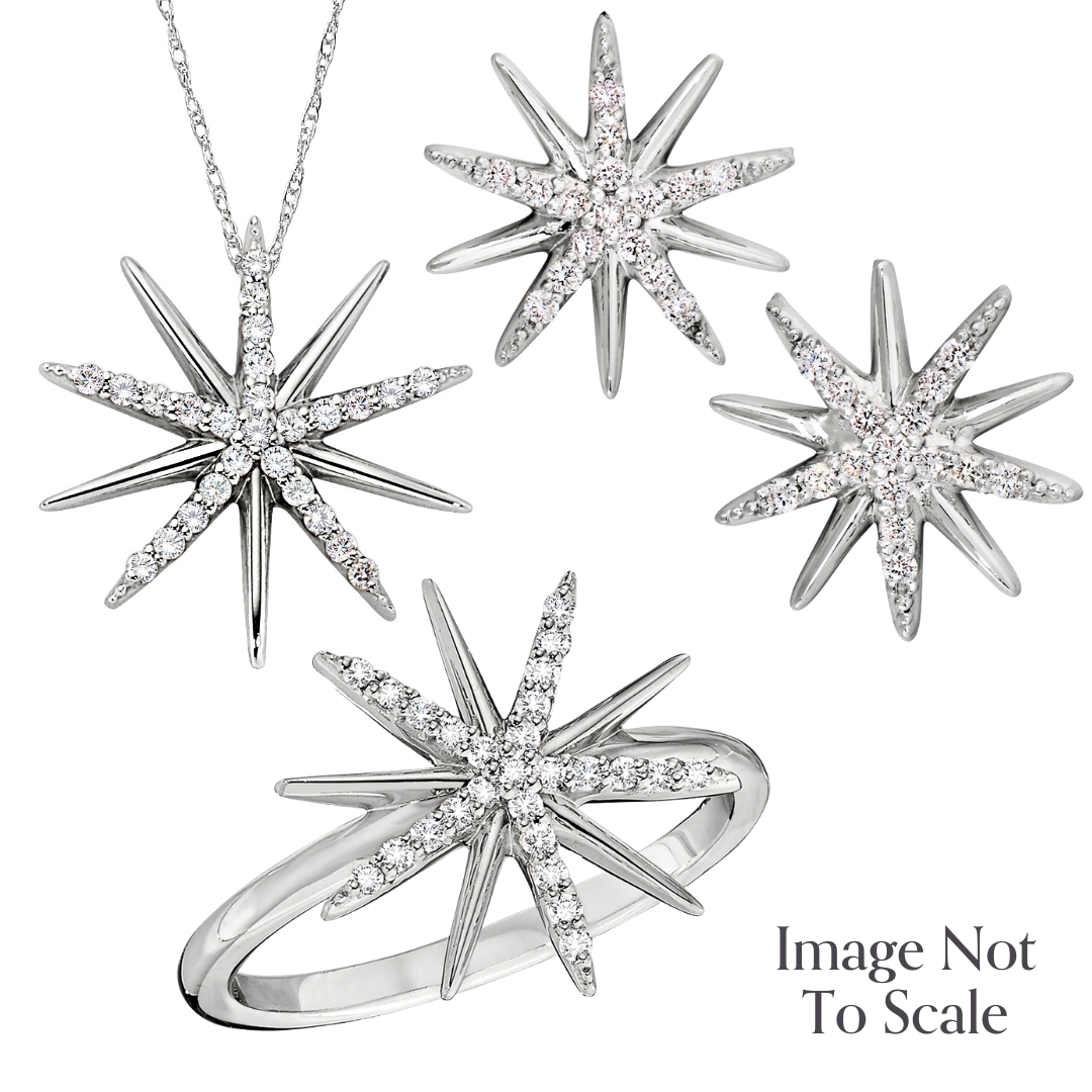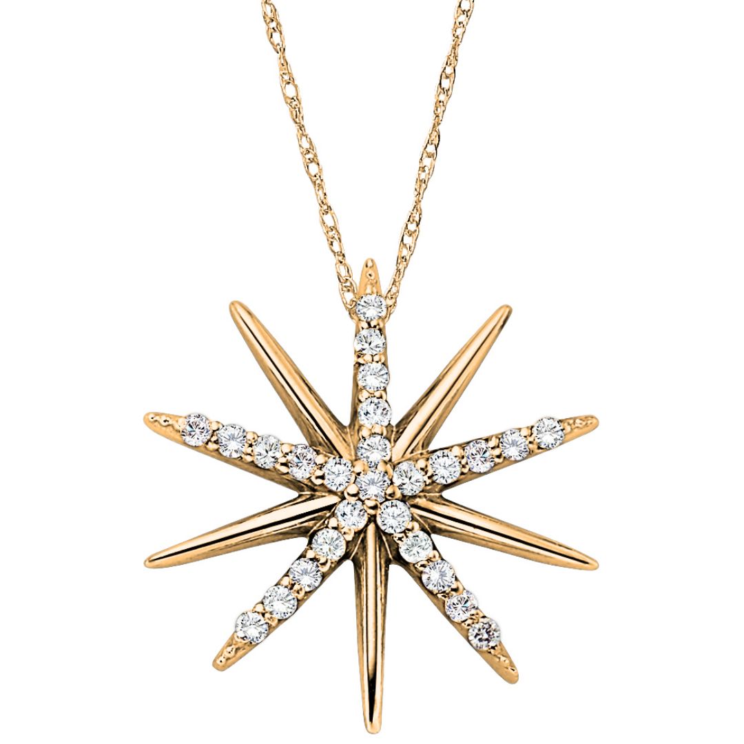 Emanating from the starburst are brilliant diamond and shimmering gold beams. As with the matching ring and earring in the set, this pendant is embellished with round brilliant diamonds. The pendant is crafted in 14KT yellow, white, and rose gold and suspended from a classic rope chain with a spring ring closure.