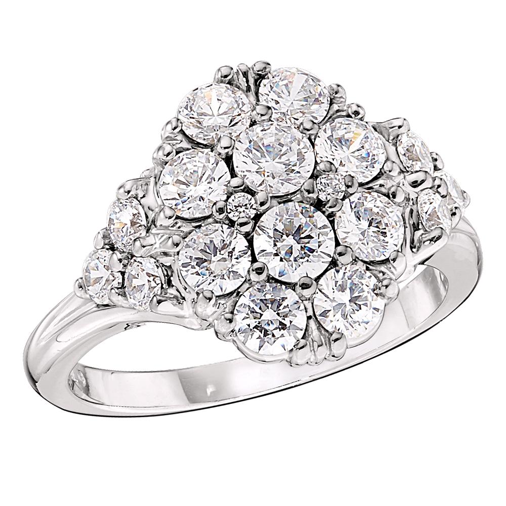 Jabel's die struck diamond clusters are engineered for beauty. The signature domed setting nestles round brilliant diamonds closely in an angular setting, allowing a greater amount of light to permeate the stones for increased brilliance. The grand version of this classic oval diamond cluster ring sits atop a classic gold band with three stone diamond settings flanking the center. The ring is crafted in 14KT yellow, white, and rose gold, 18KT yellow and white gold, and platinum. For a splash of color, the cluster can be set with emeralds, rubies, and sapphires.