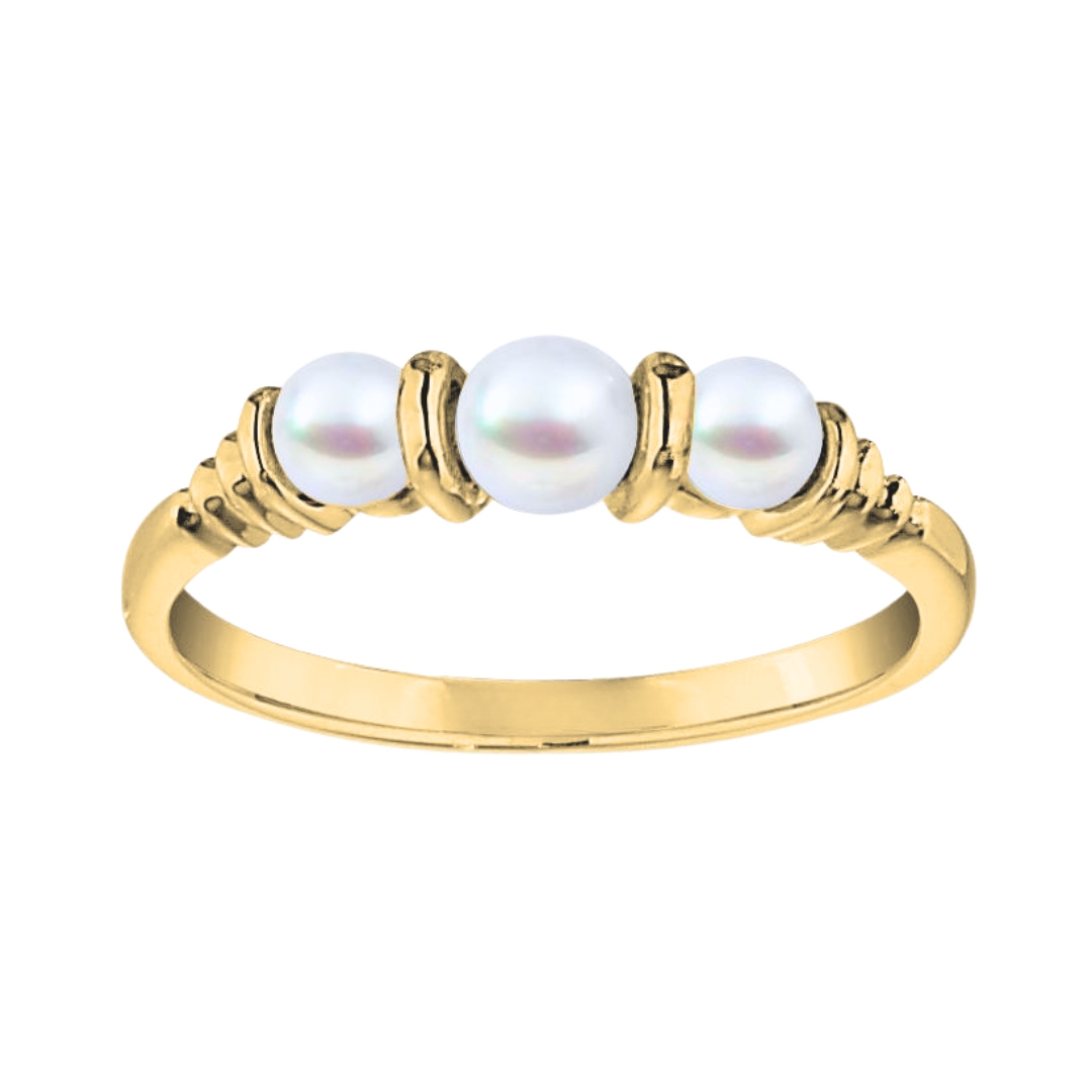 The petite version of our classic graduated three stone pearl ring is set with lustrous Akoya cultured pearls. The gold dividers and graduated ribbed detail cascade down the band to add balance and symmetry to the design. This ring is crafted in 14KT yellow, white, or rose gold.
