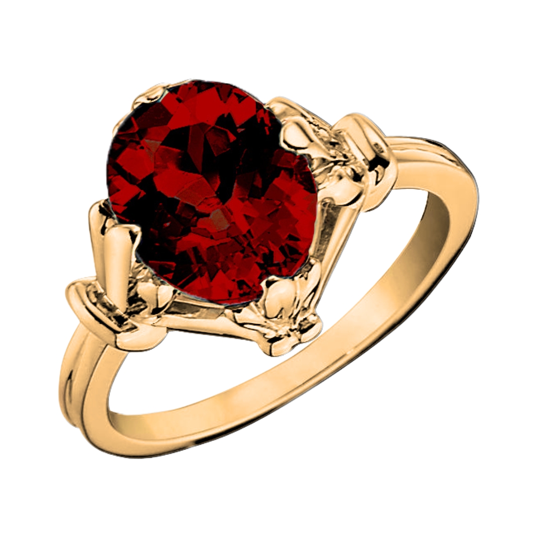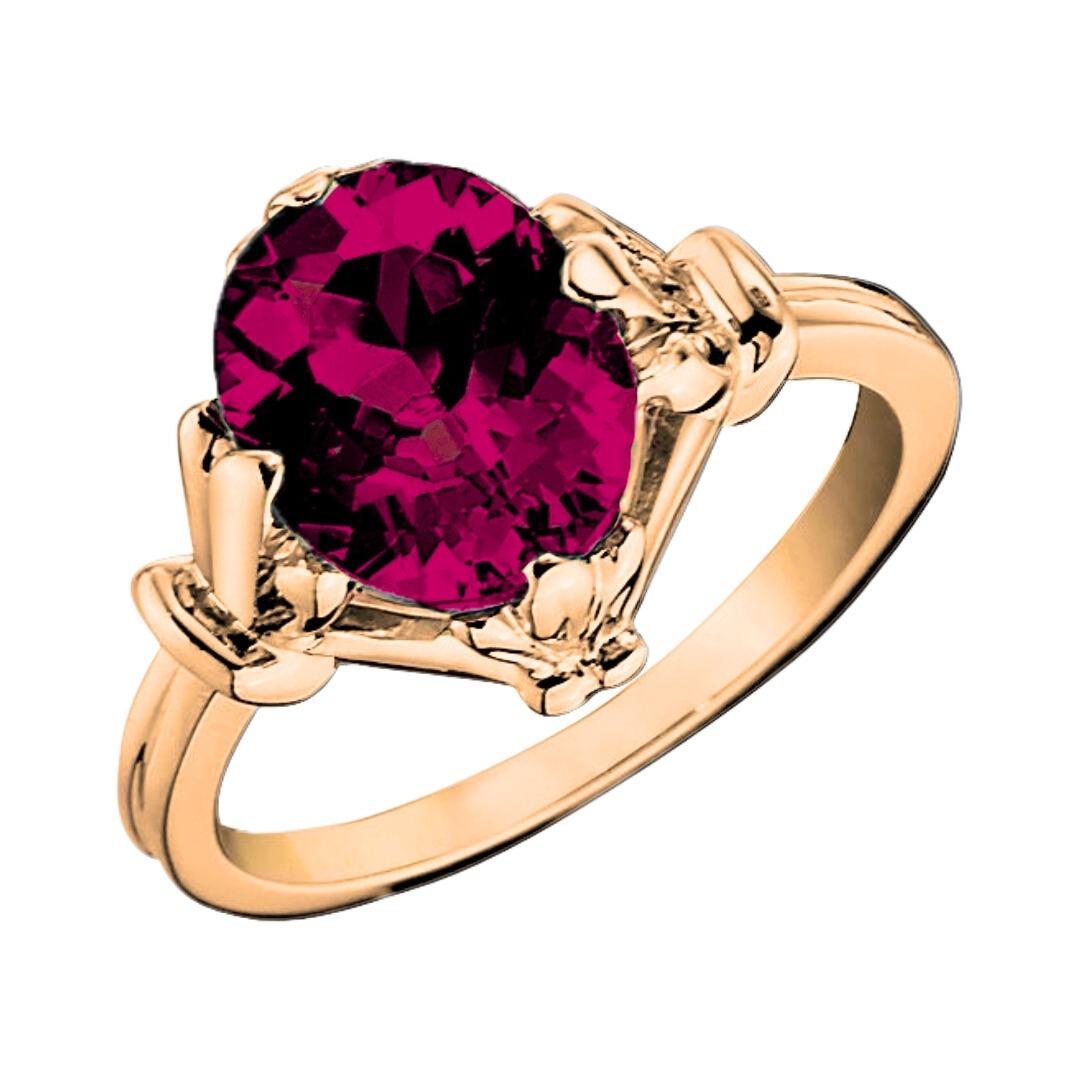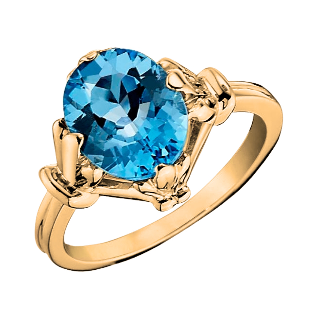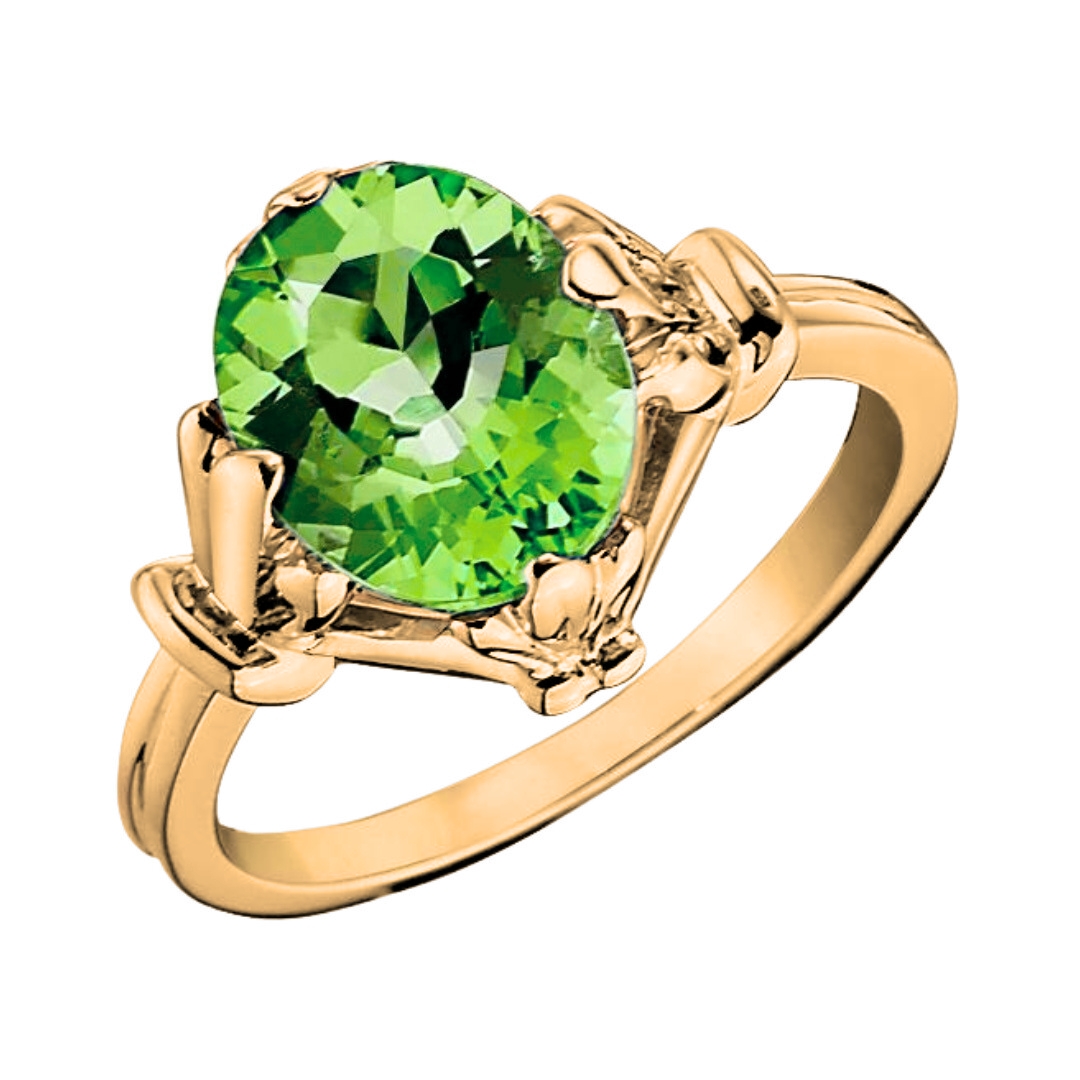 Fleur de Lis prongs, nestled a prominent oval center stone on its north, south, east, and west positions. The setting sits atop a double ribbed band that typifies vintage charm. This ring is crafted in 14KT yellow, white, or rose gold in an array of gemstones.